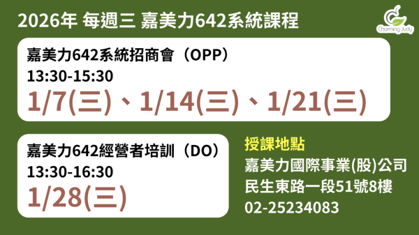 嘉美力正式引進 642 系統 攜手蕭顧問打造可複製、可長期經營的事業體系 面對直銷產業日益競爭與市場環境快速變化,嘉美力持續深化事業體質,正式引進國際知名的 642 系統,並聘請具備豐富實務經驗的 蕭顧問 擔任系統顧問,全面強化團隊培訓與事業運作架構,為經營者打造更穩健、可長期發展的事業平台。 嘉美力長期以「差異化」作為品牌核心競爭力,建立屬於公司的 黃金三角優勢——產品、公司、制度。在產品面,嘉美力以科學實證為基礎,專注於高品質細胞營養;在公司面,重視制度健全、合規經營與長期陪伴;在制度面,則持續優化獎金結構與發展路徑,協助經營者穩定成長、持續累積。 在此基礎之上,642 系統的導入,為嘉美力事業版圖補上關鍵一環。蕭顧問指出,成功的事業系統,關鍵不在於個人能力,而在於是否具備「可被複製的系統架構」,並以 「系統三角」——工具、培訓、複製工作者,作為團隊穩定擴展的核心。 透過清楚的工具設計,讓經營者知道「該做什麼、怎麼做」;透過系統化培訓,協助每位夥伴建立正確觀念與操作能力;再透過複製工作者的機制,讓成功經驗得以被持續傳承與放大,進而打造穩定、長久的團隊運作模式。 嘉美力表示,642 系統的正式導入,並非短期策略,而是著眼於長期事業發展的重要布局。未來,將持續與蕭顧問及 642 系統團隊深度合作,協助更多經營者建立正確事業觀、培養可複製的能力,讓每一位夥伴都能在制度與系統的支持下,穩健前行,持續突破。